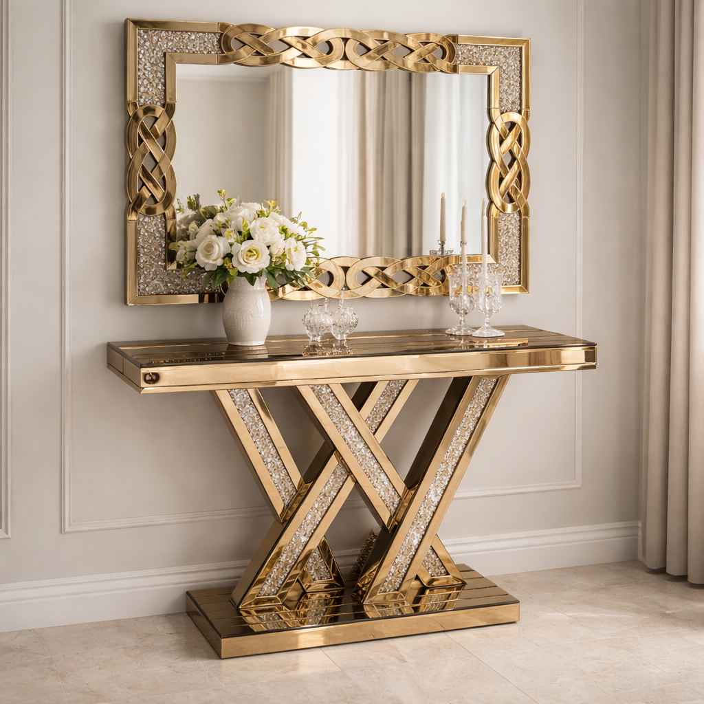 This modern console boasts a shiny silver/golden finish for a luxurious feel. Its design gives a geometric silhouette with sculptural appeal. Add to any room for a sophisticated atmosphere.