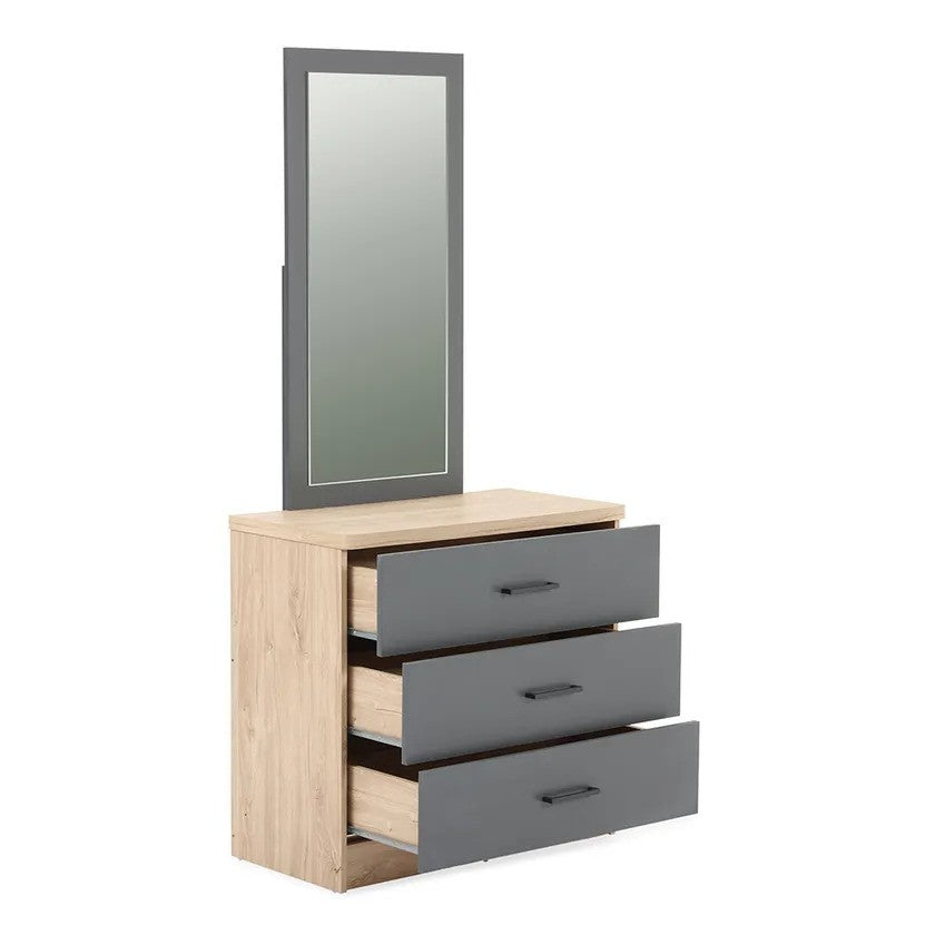 The modern and original combination of ivory oak with elegant dark elements is the essence of the April collection. The April Dresser with Mirror features an original design and 3 drawers were you can store clothes and assessories, while a charming mirror complete the ensemble. An excellent choice for those who appreciate minimalism and functionality.