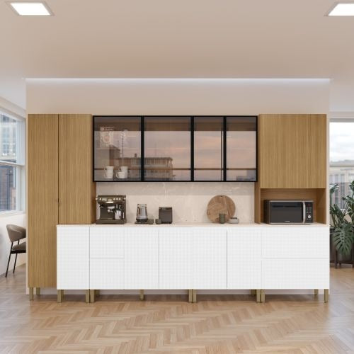 Transform your kitchen with style and functionality with this Modulated kitchen 6PCS. Designed to make the most of your space while adding a touch of elegance. With its clean lines, upper cabinets with glass doors, a microwave niche, and a spacious countertop for everyday appliances, it brings practicality to your daily routine. Multiple lower cabinets for organization, while durable adjustable feet and sleek handles guarantee long-lasting quality. The perfect choice for those who want a kitchen that combines beauty, durability, and efficiency in one solution.