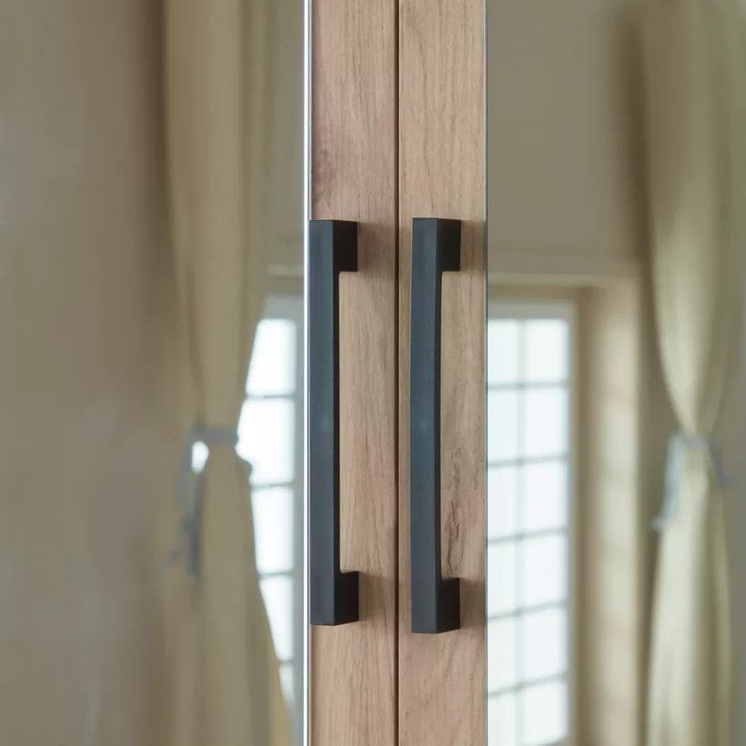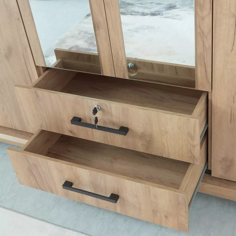 Elegant and functional, this 6-door wardrobe combines style with practicality. Featuring a warm wood finish, two central mirrors, and two lower drawers, it offers ample storage space while enhancing the room’s décor. The sleek black handles and clean lines add a modern touch, making it a versatile choice for contemporary bedrooms.
