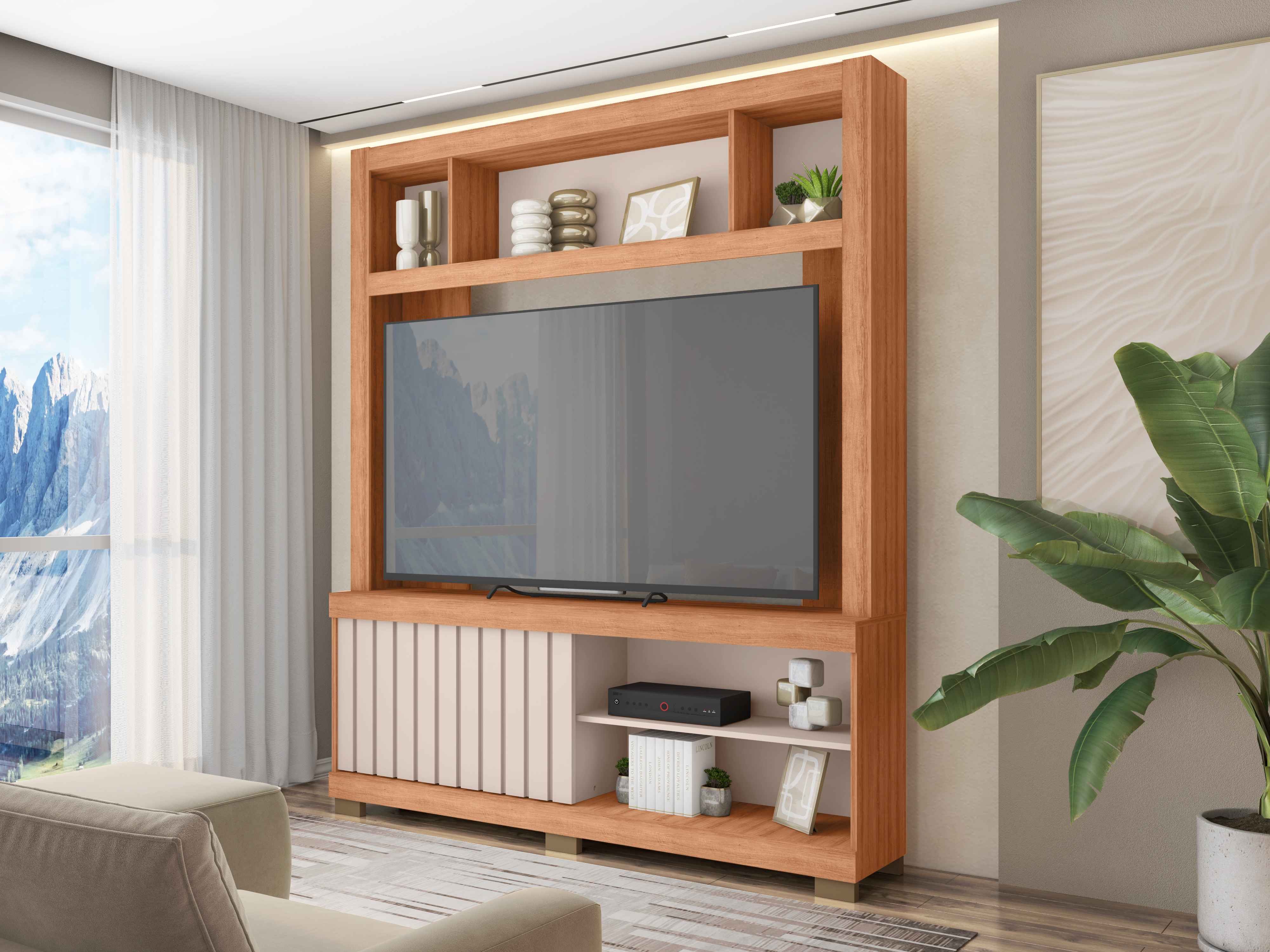 Bring elegance to the living room with this Entertainment TV Unit. It blends modern design with smart storage solutions. Featuring a space for large TVs, decorative open niches, and lower compartments and open shelves, it offers functionality, making it a versatile centerpiece that enhances any contemporary or classic décor.