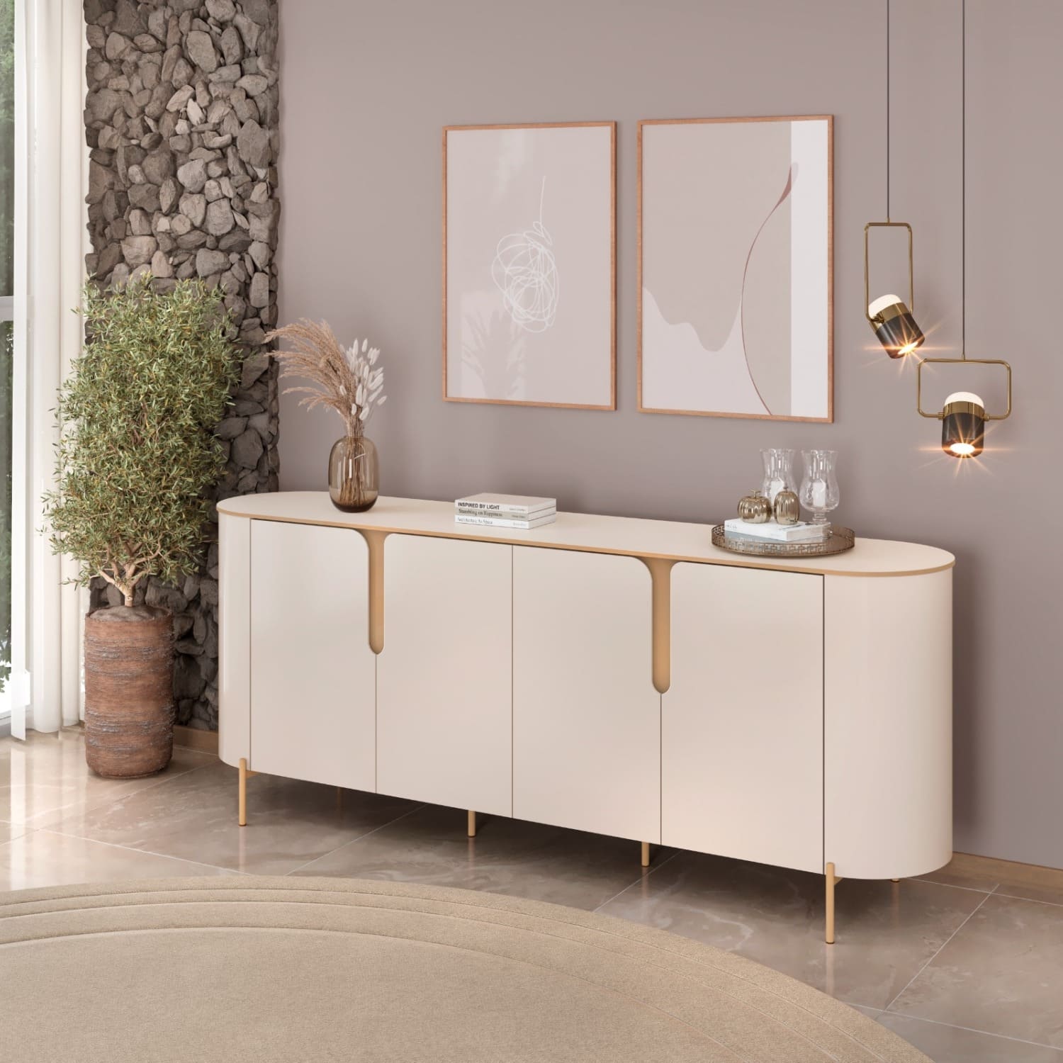 With its smooth curved edges, soft neutral finish, and golden accents, this buffet adds a modern and refined touch to any dining or living space. It features four spacious doors that provide ample storage for tableware and essentials, while slim metallic legs ensure durability with a light, elegant look. A perfect blend of style and practicality, making it an eye-catching centerpiece for your décor.