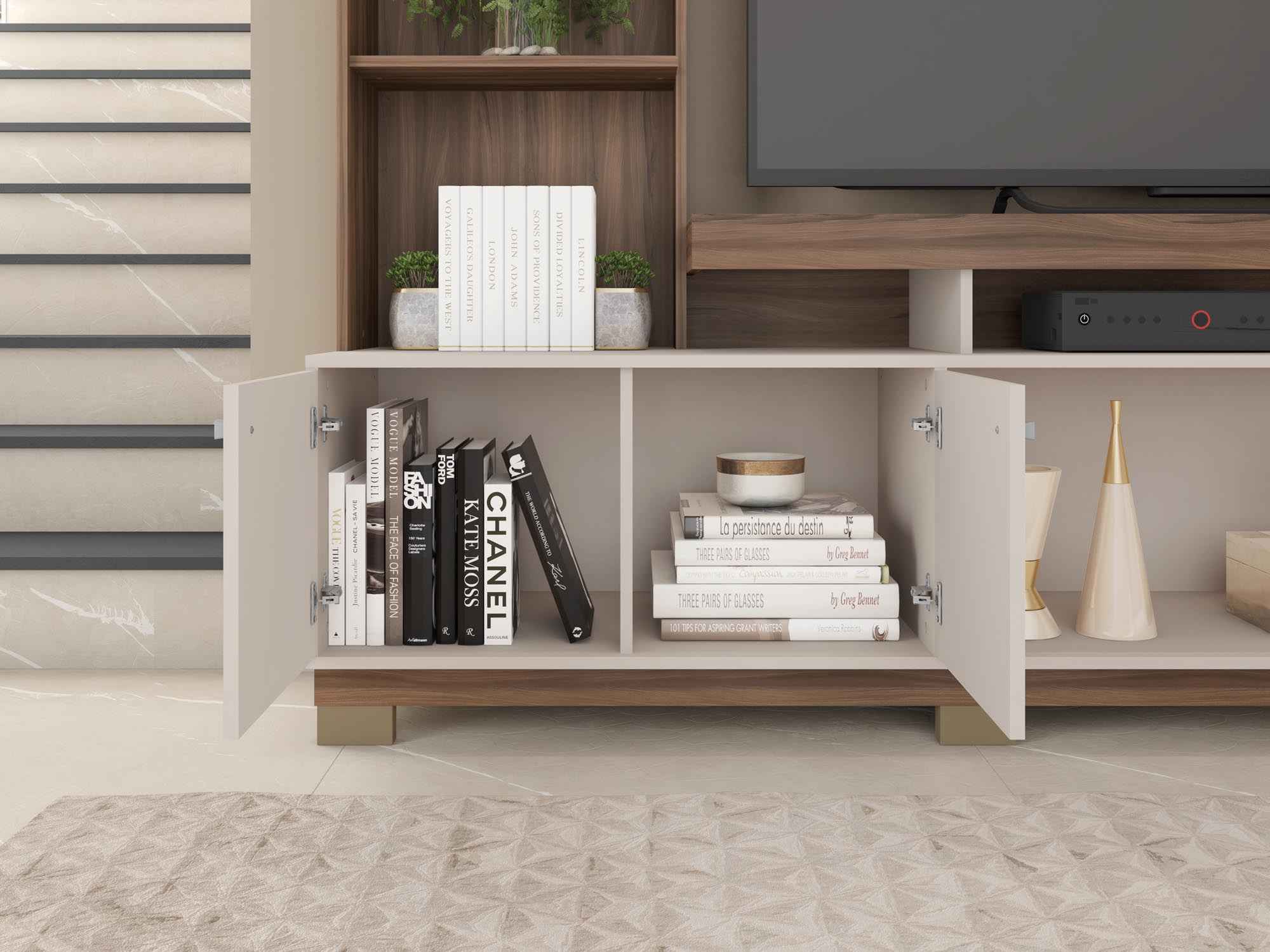 Blending elegance and functionality, this TV Unit showcases modern lines with refined finishes like leather handles and micro-rippled texture. Featuring two doors, a drawer, and open niches, it provides organized storage. LED lighting enriches the environment, adding warmth and sophistication.