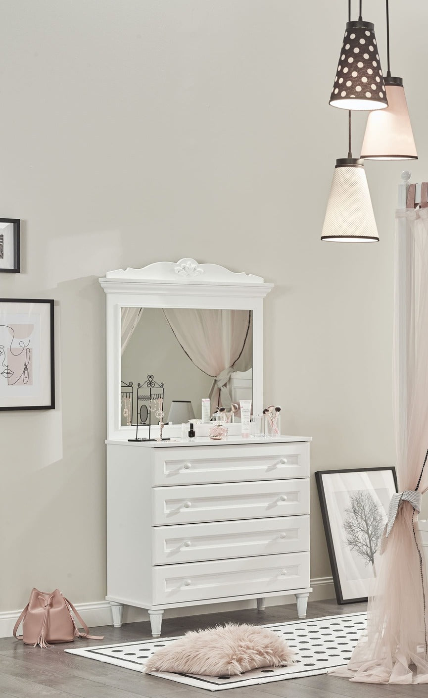 The Lora Dresser & Mirror is a great addition to your bedroom combining functionality and elegance. Features four drawers to store clothes and essential, while a charming mirror complete the ensemble. Retro gorgeous styling reveals the elegant royal feeling. Making a perfect statement to girl´s room.