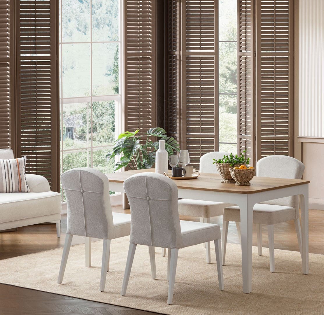This 6 Seats Dining Tble Set blends refined contemporary lines, bringing timeless classical elegance into modern living spaces. The table’s balanced color harmony creates a sophisticated focal point, while the finely stitched detailing on the chairs adds texture and dynamic charm. Elevate the atmosphere of the dining room, offering both style and comfort for everyday meals and special gatherings alike.