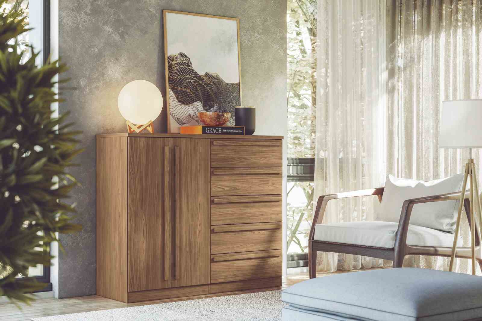 With a modern look and clean lines, this Chest of Drawers provides ample storage space, ideal for organizing clothes, accessories, and personal items. Compact yet highly functional, it adapts easily to different bedroom styles, making it a versatile choice for those who seek cozy elegance to any home decor.