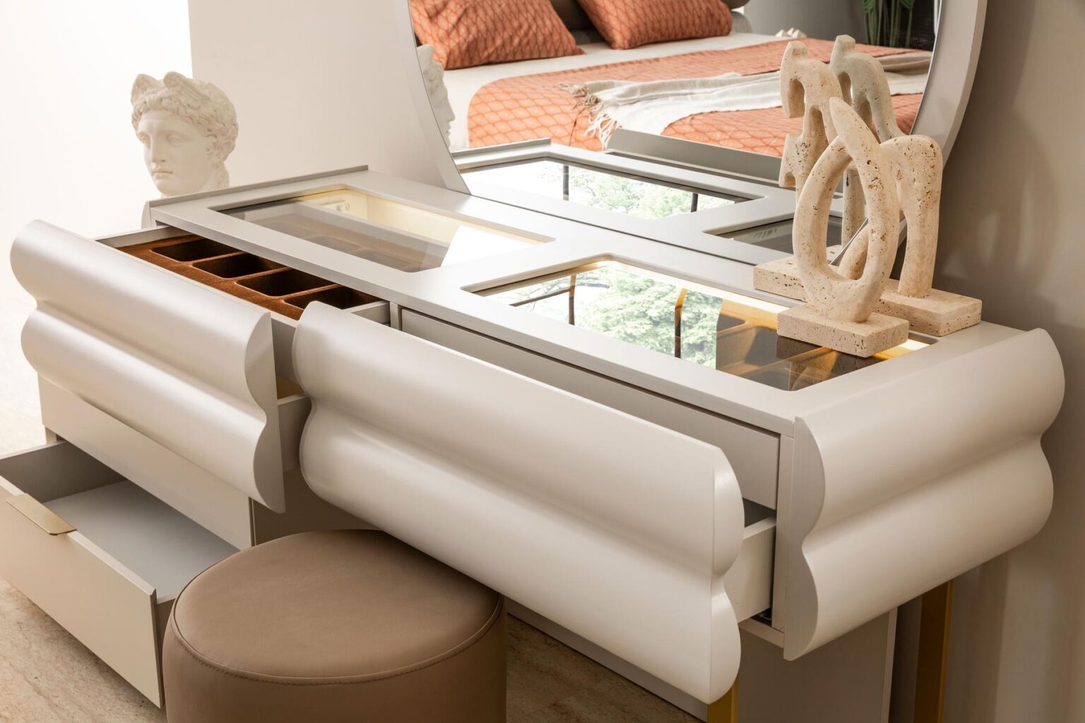 Add a perfect blend of modern elegance and timeless sophistication with this King Bedroom Set. Designed to create a luxurious and serene atmosphere in any room. The king-size bed, with its sleek lines and refined detailing, serves as a stunning focal point, offering both comfort and style. Complemented by matching nightstands, a spacious dresser an elegant mirror and comfortable pouffe, this set provides ample storage while enhancing the room’s aesthetic appeal. Making it an ideal choice for those seeking a harmonious balance of beauty, functionality, and cozy to any retreat.