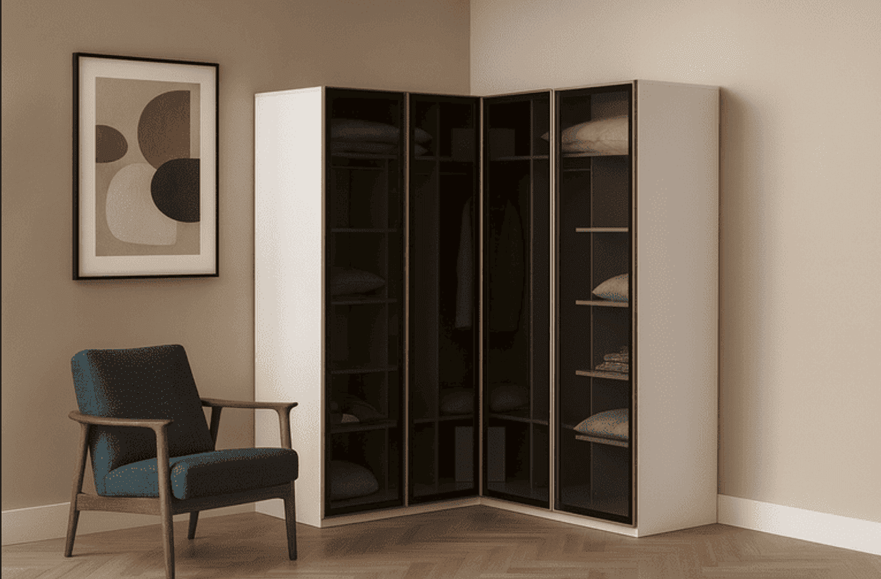 Upgrade your bedroom with this modern Corner Sliding Wardrobe. An elegant storage solution designed to maximize space in a bedroom. Clean-lined, minimalist form with a smooth light-colored exterior that contrasts beautifully with smoked reflective glass. This piece balances minimalism with cozy charm, making it an ideal choice for any decor.