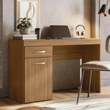 Bring functionality and style to your home office with a Desk designed for comfort and efficiency. Its wide tabletop offers ample space for your computer, books, and accessories, while the integrated drawer and cabinet with modern built-in handles keep your essentials stored and always within reach, making your daily routine more practical and enjoyable.