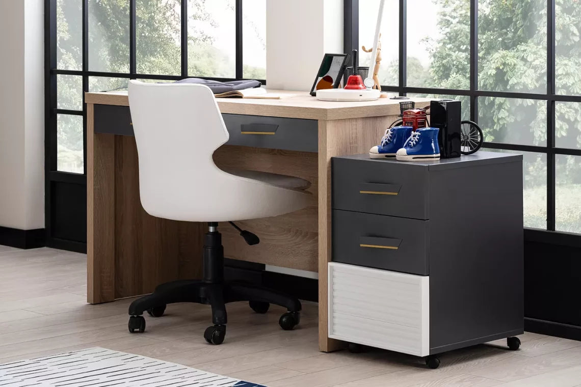 Designed with a striking blend of oak textures, matte black tones, and ribbed white accents, this collection brings bold character and intelligent storage into any youth room. Create a workspace that motivates with this Trolley. Features ample functional space for school supplies, books and accessories making this piece both functional and fashionable.