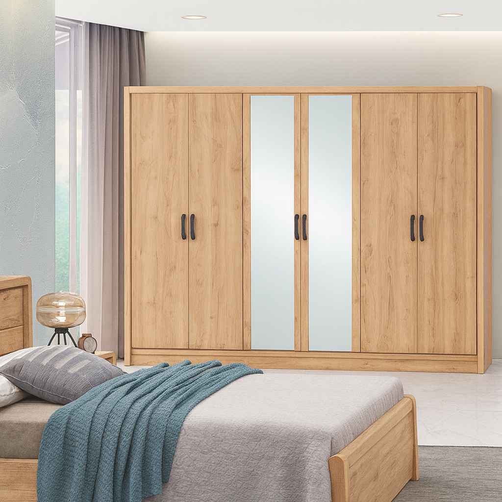 Elevate your space with timeless collection. This Wardrobe seamlessly blends rustic elegance with modern design, offering both style and storage in one sophisticated piece. Its clean lines make it a standout addition for any bedroom. With ample storage behind six spacious doors, it helps keep your room beautifully organized while the large mirrors reflecct elegance to your décor.