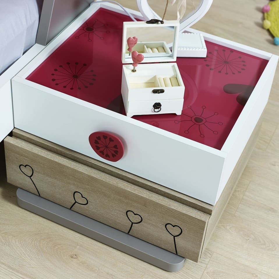 Every girl dreams of being a princess, at least at some point in her life. The Sweety Nightstand comes in a royal fuchsia/white combination to match the fantasy of a little princess room, bringing elegance and charm. It features two drawers with storage space for your essentials, and the top can be used to display a table lamp or decorations. Making it a perfect addition to your bedroom decor.